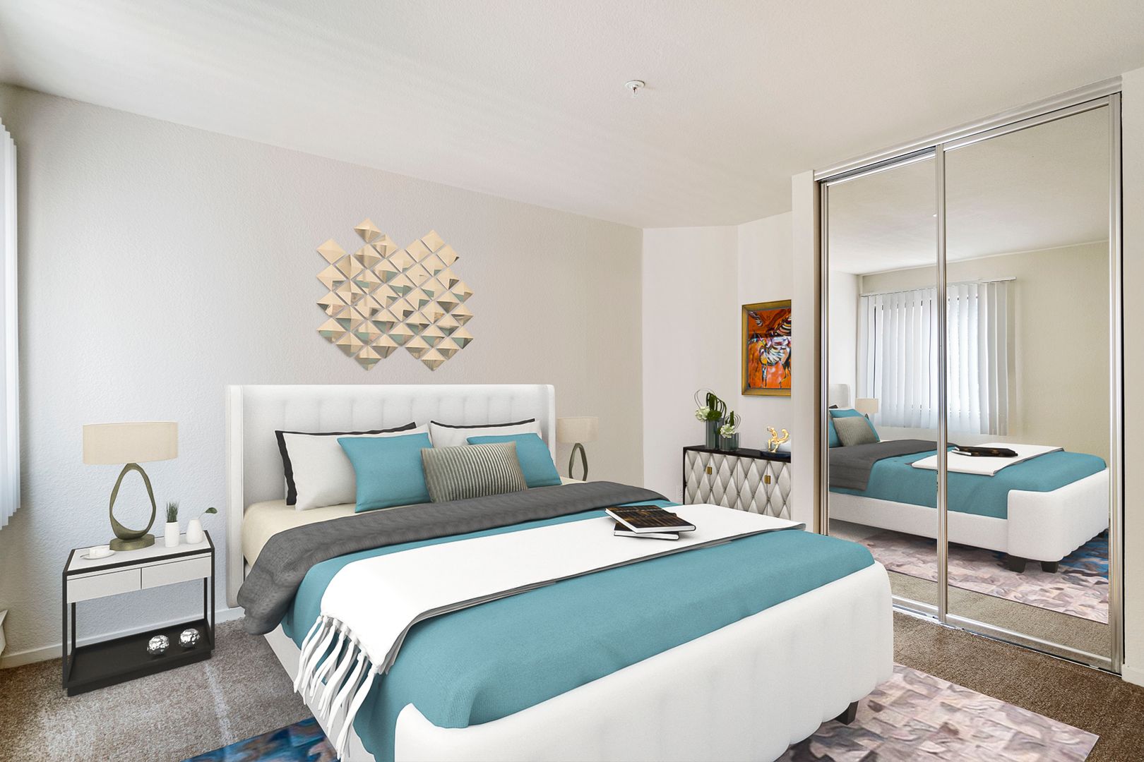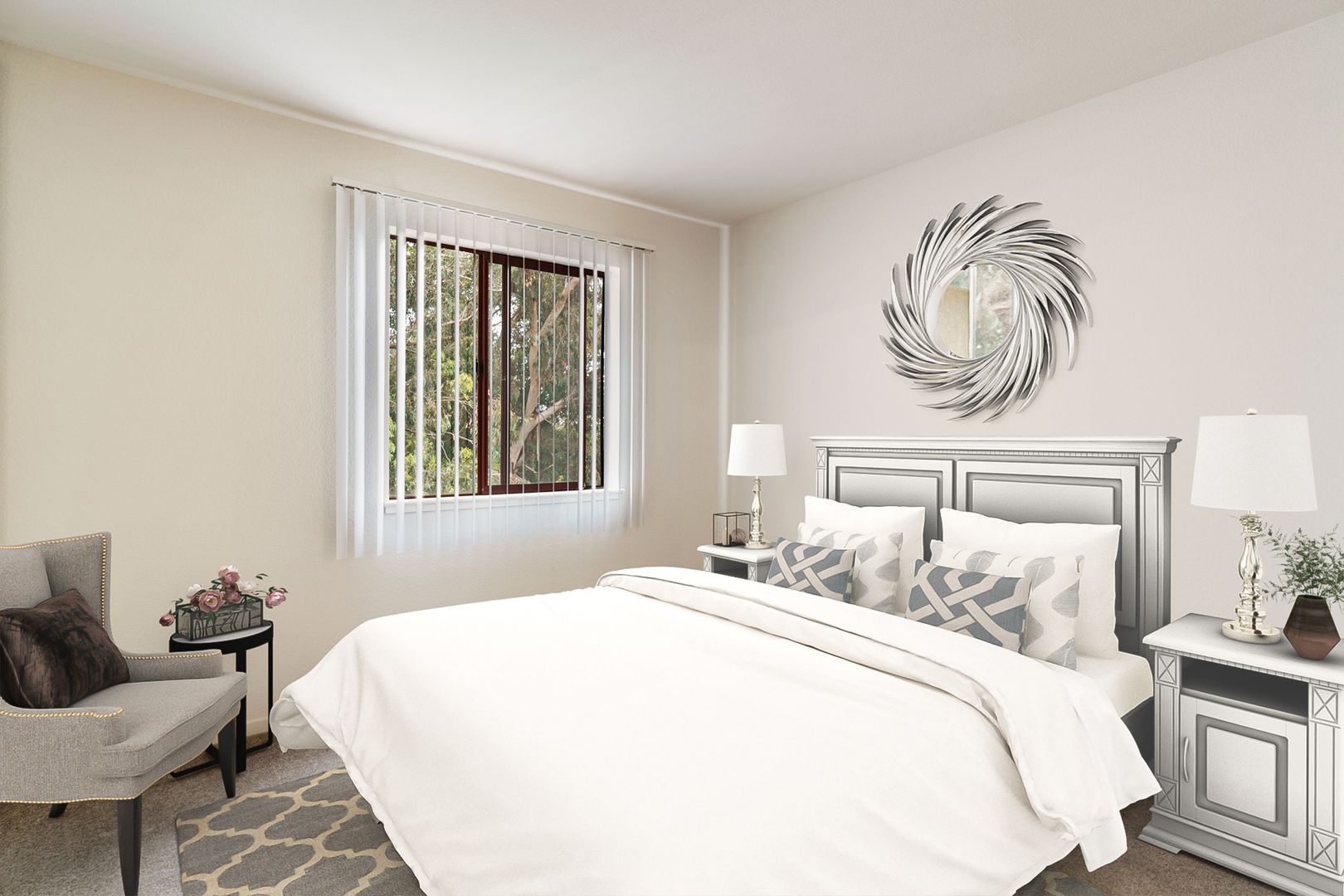 • Contemporary window coverings at living room and bedroom(s)