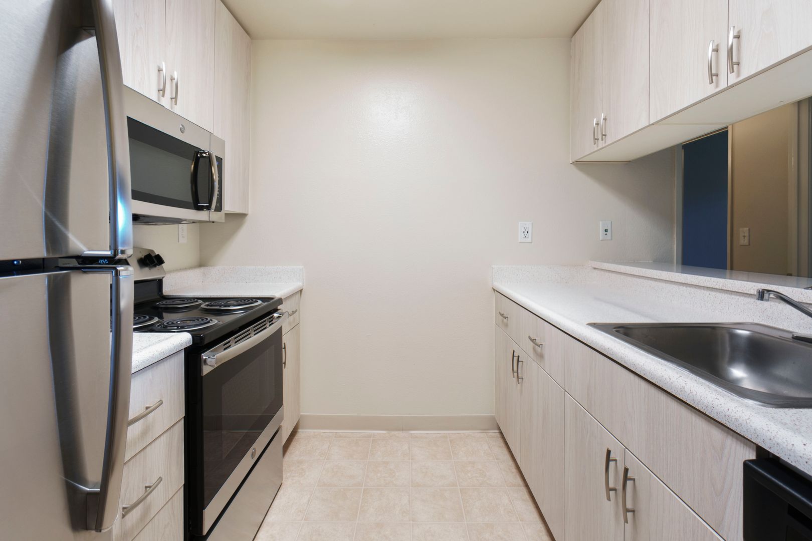 • Energy-efficient stainless steel appliances including frost-free refrigerator, electric range, microwave, dishwasher, and disposal